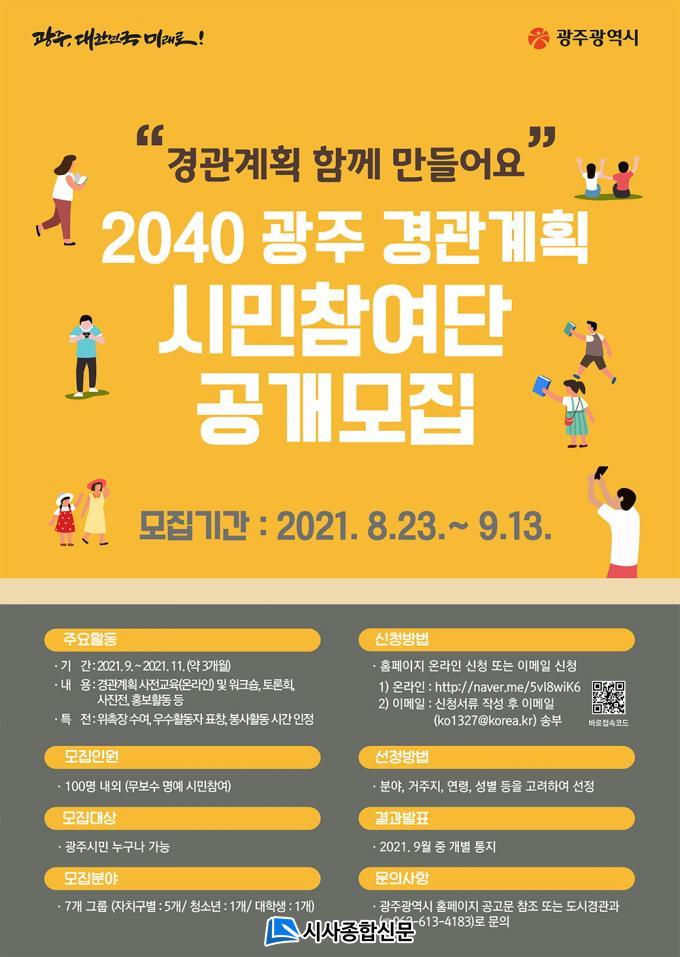 ¡®2040 ±¤ÁÖ °æ°ü°èȹ ½Ã¹ÎÂü¿©´Ü¡¯Àº °æ°ü°èȹ »çÀü±³À°, ¿öÅ©¼ó, Åä·Ðȸ µî¿¡ Âü¿©ÇØ ±¤Áֽà °æ°ü ¹Ì·¡»ó ¼³Á¤À» À§ÇØ ÇÔ²² °í¹ÎÇϰí, °æ°ü°èȹÀÇ ºñÀü°ú ÃßÁø Àü·«, ¾ÆÀ̵ð¾î ¹ß±¼À» À§ÇÑ ´Ù¾çÇÑ È°µ¿µéÀ» ¼öÇàÇÒ ¿¹Á¤ÀÌ´Ù. ½Ã¹ÎÂü¿©´Ü Ȱµ¿À» ÅëÇØ Á¦¾ÈµÈ ÀǰßÀº ¡®2040 ±¤ÁÖ µµ½Ã°æ°ü°èȹ¡¯¿¡ ¹Ý¿µµÉ ¿¹Á¤ÀÌ´Ù.