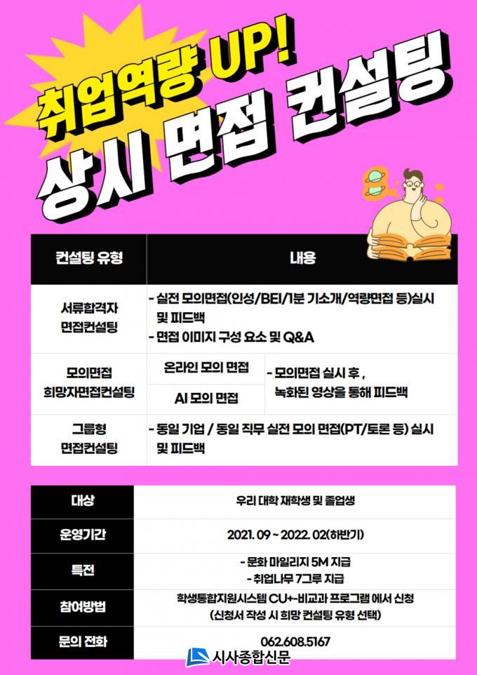 ¿ÃÇØ 9¿ùºÎÅÍ 2022³â 2¿ù±îÁö ¿î¿µµÇ´Â ¡®»ó½Ã ¸éÁ¢ ÄÁ¼³ÆÃ¡¯Àº Ãë¾÷Áغñ»ýµé¿¡°Ô ´Ù¾çÇÑ ¸éÁ¢ üÇè±âȸ¿Í ½ÇÀü ¸ðÀǸéÁ¢, ¿Â¶óÀÎ, AI µî À¯Çüº° ¸éÁ¢ ±âȸ¸¦ Á¦°øÇϱâ À§ÇØ ¸¶·ÃµÆ´Ù.