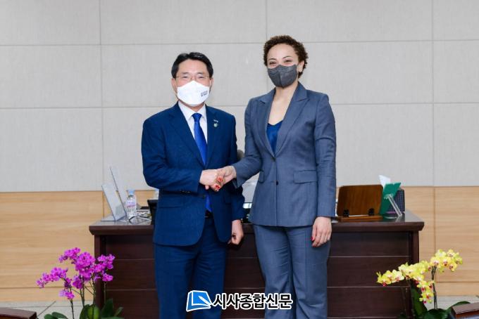 [½Ã»çÁ¾ÇսŹ® = ¿À½ÂÅà ±âÀÚ] ±Ç¿ÀºÀ ¿©¼ö½ÃÀåÀÌ 29ÀÏ 2021 µµ½Ãȯ°æÇù¾à ¿©¼öÁ¤»óȸÀÇ Âü¼®ÇÑ ¶ó»þ ¾ÆÅ½´Ï ÁÖÇÑ À̽º¶ó¿¤ °ø°üÂ÷¼®°ú ¹ÇÀ¢µ¥ ¹ÇÀ©Áö ÁÖÇÑ ÄÉ³Ä ´ë»ç¸¦ ¸¸³ª Àç»ý¿¡³ÊÁö¿Í ±âÈÄ º¯È º¹¿ø·Â ¹× Çù·Â °¡´ÉÇÑ ºÐ¾ß µî¿¡ ´ëÇØ ±ä¹ÐÈ÷ ³íÀÇÇß´Ù.