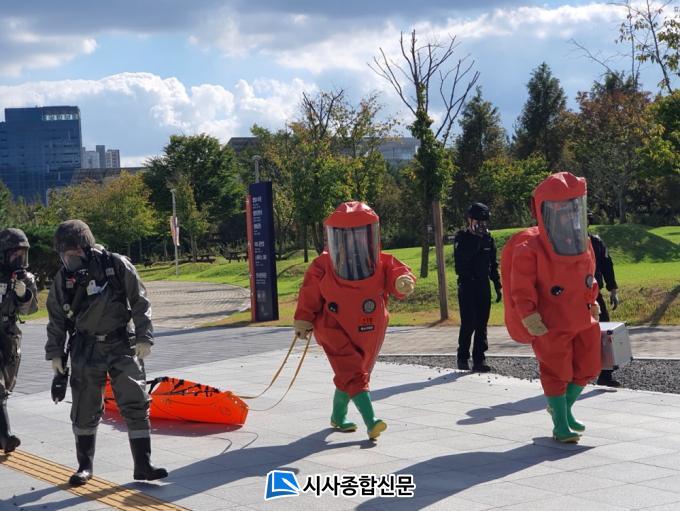 À̹ø ÈÆ·Ã¿¡´Â ±¤ÁÖ°æÂûû ¹× °æÂû¼, °æÂûƯ°ø´ë, ±¤ÁÖ¼Ò¹æ¾ÈÀüº»ºÎ 119Ư¼ö±¸Á¶´Ü, À°±º Á¦31º¸º´»ç´Ü°ú °ø±º Á¦1ÀüÅõºñÇà´ÜÀÇ È»ý¹æÁö¿ø´ë, ¿µ»ê°À¯¿ªÈ¯°æÃ» µî 16°³ ±â°üÀÌ Âü¿©ÇÏ¿© Æø¹ß¹° ¹× È»ý¹æ¹°Áú µîÀ» ÀÌ¿ëÇÑ º¹ÇÕÅ×·¯ »óȲÀ» °¡Á¤ÇÏ¿© ÈÆ·ÃÀ» ÁøÇàÇÏ¿´À¸¸ç ¡®Äڷγª19¡¯ °¨¿° È®»ê ¿¹¹æÀ» À§ÇØ Âü¿© ÀοøÀ» ¹é½ÅÁ¢Á¾ ¿Ï·áÀÚ À§ÁÖ 49ÀÎÀ¸·Î Á¦ÇÑÇÏ¿´´Ù.