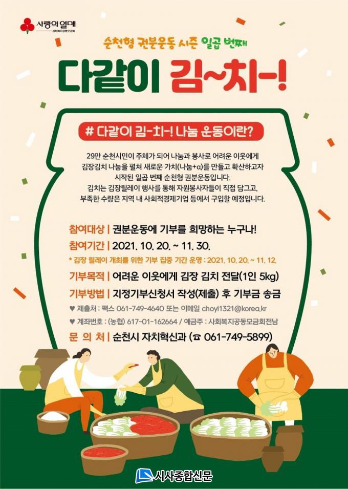 ¼øÃµÇü ±ÇºÐ¿îµ¿ ½ÃÁð7 ¡®´Ù°°ÀÌ ±è-Ä¡-!¡¯´Â ³ª´®°ú ºÀ»ç·Î 29¸¸ ¼øÃµ½Ã¹ÎÀÌ ³ª´® ±× ÀÌ»óÀÇ »õ·Î¿î °¡Ä¡¸¦ ¸¸µé°í È®»êÇÏÀÚ´Â ÃëÁö¿¡¼ ½ÃÀ۵ƴÙ.