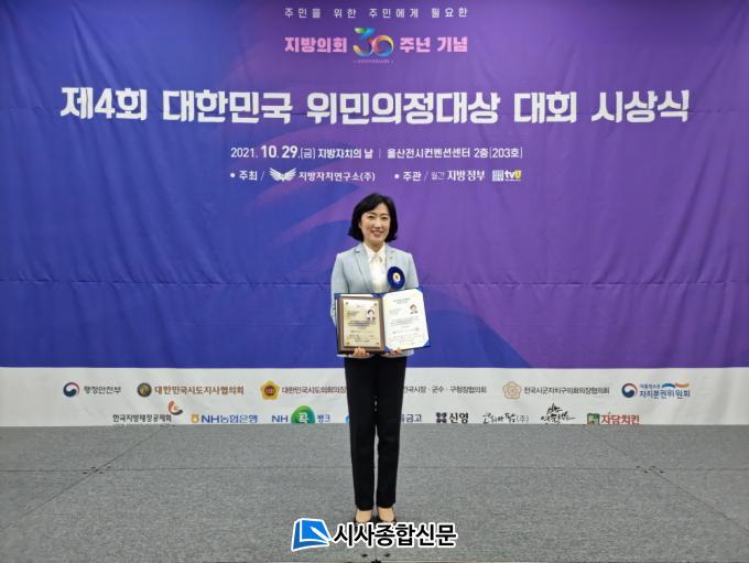 [½Ã»çÁ¾ÇսŹ® = ¿À½ÂÅà ±âÀÚ] ±¤ÁÖ±¤¿ª½ÃÀÇȸ ½Å¼öÁ¤(´õºÒ¾î¹ÎÁÖ´ç․ºÏ±¸3) ÀÇ¿øÀº 29ÀÏ ¿ï»êÀü½ÃÄÁº¥¼Ç¼¾ÅÍ¿¡¼ ¿¸° ¡®Á¦4ȸ ´ëÇѹα¹ À§¹ÎÀÇÁ¤´ë»ó¡¯ ½Ã»ó½Ä¿¡¼ ¡¸±¤ÁÖ±¤¿ª½Ã ÀºµÐÇü¿ÜÅçÀÌ Áö¿ø Á¶·Ê¡¹¸¦ Àü±¹ ÃÖÃÊ·Î ¹ßÀÇÇÑ °ø·Î¸¦ ÀÎÁ¤¹Þ¾Æ ÃÖ¿ì¼ö»óÀ» ¹Þ¾Ò´Ù.