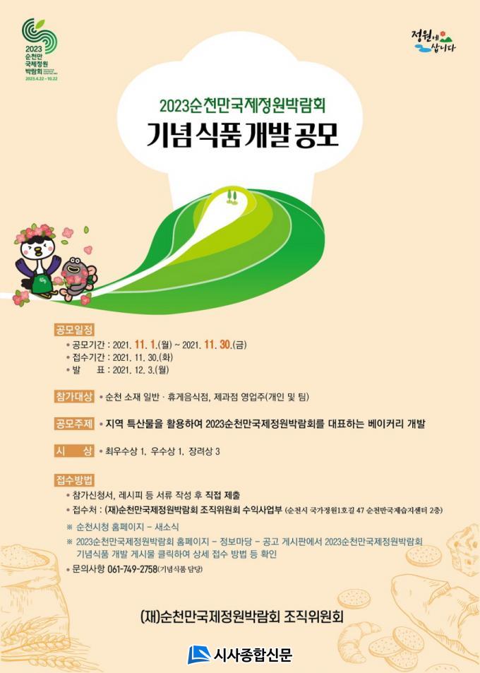 °ø¸ð ÁÖÁ¦´Â ¡®Áö¿ª ³ó»ê¹°À» Ȱ¿ëÇÑ 2023¼øÃµ¸¸±¹Á¦Á¤¿ø¹Ú¶÷ȸ ´ëÇ¥ º£ÀÌÄ¿¸® °³¹ß¡¯·Î, ¼øÃµ ¼ÒÀç ÀϹÝÀ½½ÄÁ¡¡¤ÈÞ°ÔÀ½½ÄÁ¡¡¤Á¦°úÁ¡ Á¡ÁÖ¶ó¸é ´©±¸³ª Âü¿© °¡´ÉÇÏ´Ù.