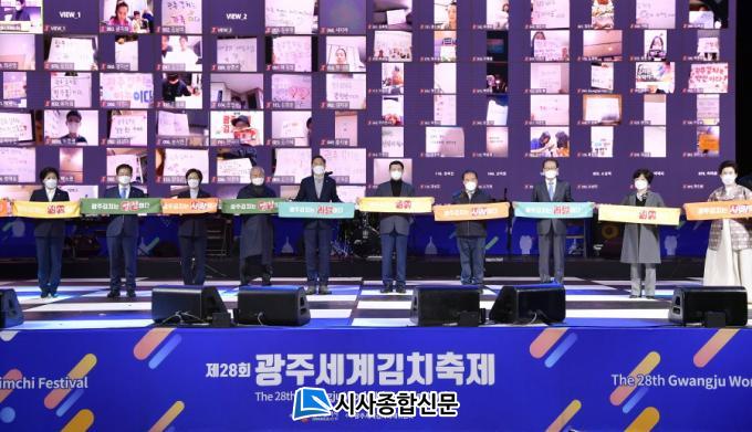 À̳¯ °ø½ÄÇà»ç¿¡¼´Â ÃàÁ¦ÀåÀ» ãÀº ¹æ¹®°´µé°ú ÇÔ²² ¿Â¶óÀÎ Ç÷§ÆûÀ¸·Î Á¢¼ÓÇÑ 100¿© ¸íÀÇ ½Ã¹ÎµéÀÌ ±¤ÁÖ±èÄ¡ÃàÁ¦ ¼¼¸®¸Ó´Ï¸¦ Çϰí, õ³âÀÇ ±¤ÁÖ±èÄ¡°¡ ¿Ï¼ºµÇ´Â °úÁ¤°ú ¼¼°è ¼ÓÀ¸·Î ºñ»óÇÏ´Â ±¤ÁÖ±èÄ¡¸¦ ¾Ë¸®±â À§ÇÑ ¹Ìµð¾î ¿µ»ó »ó¿µ, ·¹ÀÌÁ® ¹× µå·Ð ¶óÀÌÆÃ ºÒ²É¼î, °¡¼ö È«ÀÚ, Áö¿ª ¹ÂÁö¼Ç ±è»ê¿Á(Á¶¼±ÆÇ½ºÅ¸ ¿ì½ÂÀÚ) ¾¾ÀÇ ÃàÇϰø¿¬ÀÌ À̾îÁ³´Ù.