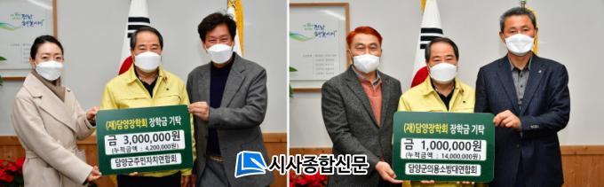 ´ã¾ç±º¿¡ µû¸£¸é Áö³ 14ÀÏ Áö¿ªÀÎÀç À°¼ºÀ» À§ÇØ ´ã¾ç±ºÁÖ¹ÎÀÚÄ¡¿¬ÇÕȸ(ȸÀå ÀÌÁ¾¿Á)¿¡¼ 300¸¸¿ø(´©Àû±Ý¾× 420¸¸¿ø)À», ´ã¾ç±ºÀÇ¿ë¼Ò¹æ´ë¿¬ÇÕȸ(ȸÀå ¹èµ¿°ü)¿¡¼ 100¸¸¿ø(´©Àû±Ý¾× 1,400¸¸¿ø)À» ÀåÇбÝÀ¸·Î ±âŹÇß´Ù.