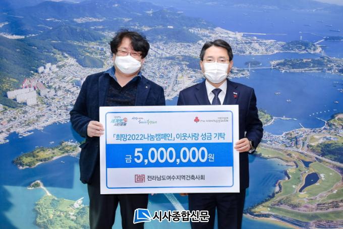 [½Ã»çÁ¾ÇսŹ® = ¿À½ÂÅà ±âÀÚ] ¿©¼öÁö¿ª °ÇÃà»çȸ(ȸÀå ±èµ¿½Ä)´Â Áö³ 22ÀÏ Äڷγª19 Àå±âÈ·Î ÁöÄ£ ¾î·Á¿î ÀÌ¿ô¿¡°Ô µû¶æÇÑ Á¤°ú Èñ¸ÁÀ» ÀüÇϰíÀÚ ¼º±Ý 500¸¸ ¿øÀ» ¸¶·ÃÇØ ¿©¼ö½Ã¿¡ Àü´ÞÇß´Ù.