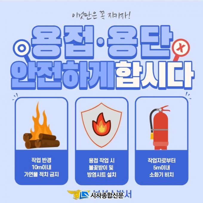 ƯÈ÷, ºÒ²ÉÀ» »ç¿ëÇÏ´Â ¿ëÁ¢ ±â±¸¸¦ »ç¿ëÇÒ ¶§¿¡´Â ÀÛ¾÷Àå ÁÖº¯ ¹Ý°æ 10m À̳»¿¡´Â °¡¿¬¹°À» ½×¾ÆµÎÁö ¾Ê¾Æ¾ß Çϰí, ¿ëÁ¢ ÀÛ¾÷ ½Ã ºÒ²É ¹ÞÀÌ ¹× ¹æ¿°½ÃÆ® ¼³Ä¡ÇÏ´Â °Í ¿Ü¿¡µµ ÀÛ¾÷ÀڷκÎÅÍ 5m À̳» ¼Òȱ⸦ ºñÄ¡ÇØ ÈÀ翹¹æÀ» À§ÇÑ ¾ÈÀüÁ¶Ä¡°¡ ÇÊ¿äÇÏ´Ù.