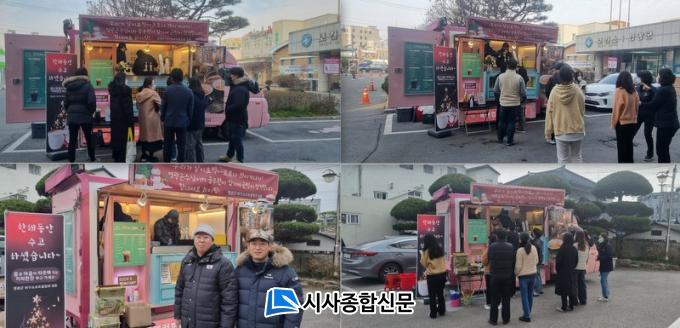 Çùȸ´Â À̳¯ º¸°Ç¼Ò¿Í ±ºÃ»À» ã¾Æ ÁÖÂ÷Àå¿¡ Ä¿ÇÇ Æ®·°À» ¼³Ä¡ÇÏ°í ¡®ÇÑ ÇØ ¼ö°íÇϼ̽À´Ï´Ù¡¯¶ó´Â ¸Þ½ÃÁö°¡ ÀûÈù Ç÷¡Ä«µå ¾Õ¿¡¼ ±Ù¹«ÇÏ´Â Á÷¿øµé¿¡°Ô Ä¿ÇÇ 1,000ÀÜÀ» ¹«·á·Î Á¦°øÇß´Ù.