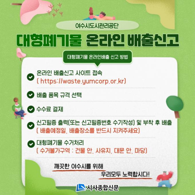 »õ·Ó°Ô ¿î¿µµÉ ½Ã½ºÅÛÀº ¿©¼ö½Ãµµ½Ã°ü¸®°ø´Ü¿¡¼ °ü¸®Çϸç, ´ëÇüÆó±â¹° ¿Â¶óÀÎ ¹èÃâ½Å°í »çÀÌÆ®(https://waste.yumcorp.or.kr)¿¡ Á¢¼ÓÇØ °áÁ¦ ÈÄ ½Å°íÇÏ¸é µÈ´Ù.