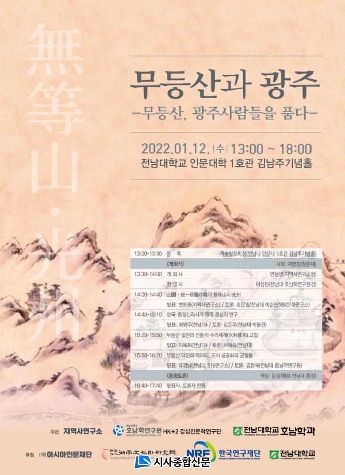 Àü³²´ë È£³²Çבּ¸¿ø(¿øÀå À̼º¿ø ±³¼ö)°ú È£³²Áö¿ª ¿ª»ç¿Í ¹®È¸¦ ¿¬±¸ÇÏ´Â Áö¿ª»ç¿¬±¸¼Ò(¼ÒÀå º¯µ¿¸í)´Â ¿À´Â 1¿ù 12ÀÏ ¿ÀÈÄ 1½Ã Àü³²´ë ±è³²ÁÖ ±â³ä Ȧ¿¡¼ ¡®¹«µî»ê°ú ±¤ÁÖ-¹«µî»ê, ±¤ÁÖ »ç¶÷µéÀ» ǰ´Ù¡¯¸¦ ÁÖÁ¦·Î Çмú´ëȸ¸¦ °®°í, »ï±¹¿¡¼ ÅëÀÏ½Å¶ó¿¡ À̸£´Â ½Ã±â¸¦ Áß½ÉÀ¸·Î ±¤ÁÖ Áö¿ª»çȸ¿ÍÀÇ ¿¬°ü ¼Ó¿¡¼ ¹«µî»êÀ» ´Ù°¢ÀûÀ¸·Î »ìÆìº»´Ù.