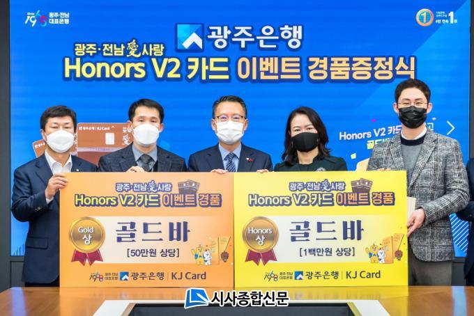 À̹ø À̺¥Æ®´Â ¡®±¤ÁÖ¡¤Àü³²äñ»ç¶û Honors V2 Ä«µå¡¯ ȸ¿ø Áß 1¹é¸¸¿ø ÀÌ»ó ÀÌ¿ë½ÇÀûÀÌ Àִ ȸ¿øÀ» ´ë»óÀ¸·Î ÃÑ 5¸íÀ» Ãß÷ÇÏ¿© Honors»ó 2¸í¿¡°Ô´Â 1¹é¸¸¿ø »ó´çÀÇ °ñµå¹Ù, Gold»ó 3¸í¿¡°Ô´Â 50¸¸¿ø »ó´çÀÇ °ñµå¹Ù¸¦ °æÇ°À¸·Î Á¦°øÇß´Ù.