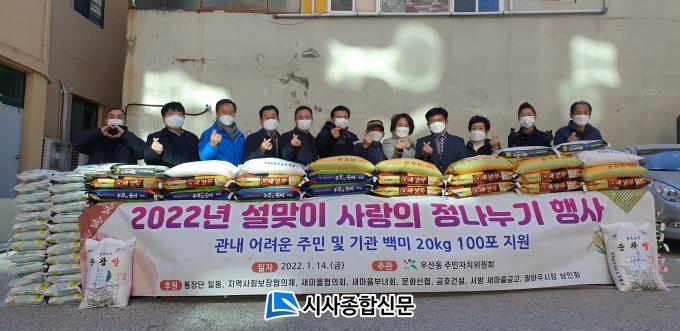 [½Ã»çÁ¾ÇսŹ® = ¿À½ÂÅà ±âÀÚ] ±¤Áֽà ºÏ±¸ ¿ì»êµ¿ ÁÖ¹ÎÀÚÄ¡À§¿øÈ¸(À§¿øÀå °Ã¢¼÷)´Â Áö³ 14ÀÏ »ç¶ûÀÇ Á¤(ï×) ³ª´©±â Çà»ç·Î ¾î·Á¿î ÀÌ¿ô°ú µµ¿òÀÌ ÇÊ¿äÇÑ °¡Á¤¿¡ ¹é¹Ì(20kg) 100Æ÷¸¦ Àü´ÞÇß´Ù°í 16ÀÏ ¹àÇû´Ù.