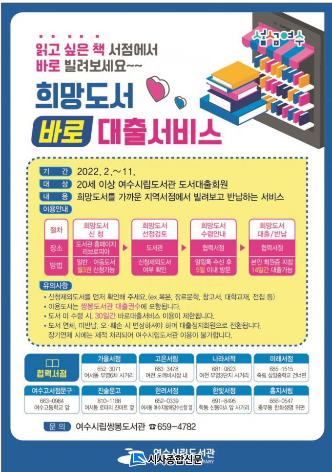 ½Ã´Â Áö³ 2021³â¿¡µµ 822¸íÀÇ ½Ã¹ÎÀÌ ¡®Èñ¸Áµµ¼ ¹Ù·Î´ëÃ⼺ñ½º¡¯¸¦ ÀÌ¿ëÇØ 1,722±ÇÀÇ º¸°í ½ÍÀº Ã¥À» ºô·ÁºÃ´Ù°í ¹àÇû´Ù. ¿©¼ö½ÃÀÇ Àû±ØÇàÁ¤À¸·Î 2016³âºÎÅÍ ½ÃÀÛµÈ ´ëÃ⼺ñ½º°¡ Ã¥À» ÁÁ¾ÆÇÏ´Â ½Ã¹Îµé »çÀÌ¿¡ ÀÚ¸®¸¦ Àâ¾Æ°¡°í ÀÖ´Ù´Â Æò°¡´Ù.