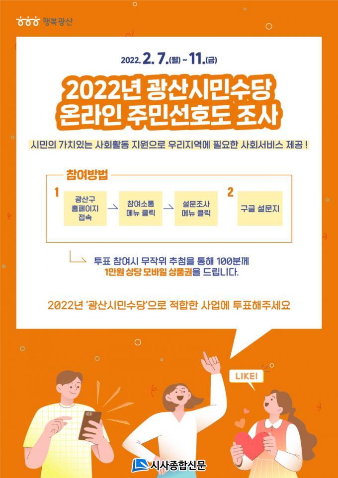 ±¤»ê±¸´Â Áö³´Þ ¸» ÀüüºÎ¼¸¦ ´ë»óÀ¸·Î ¼ö¿äÁ¶»ç ½Ç½ÃÇÏ¿© ÃÑ 21°³(ÀϹÝÇü 14°³, Àü¹®Çü 7°³) »ç¾÷À» ¹ß±¼Çß´Ù. ÁֹΠ¼±È£µµ Á¶»ç °á°ú´Â 2022³â ±¤»ê½Ã¹Î¼ö´ç Áö¿ø»ç¾÷ ¼±Á¤¿¡ ¹Ý¿µÇÒ °èȹÀÌ´Ù. ÃÖÁ¾ ¼±Á¤Àº 2¿ù ¸» ±¤»ê½Ã¹Î¼ö´çÀ§¿øÈ¸¿¡¼ °áÁ¤µÈ´Ù.