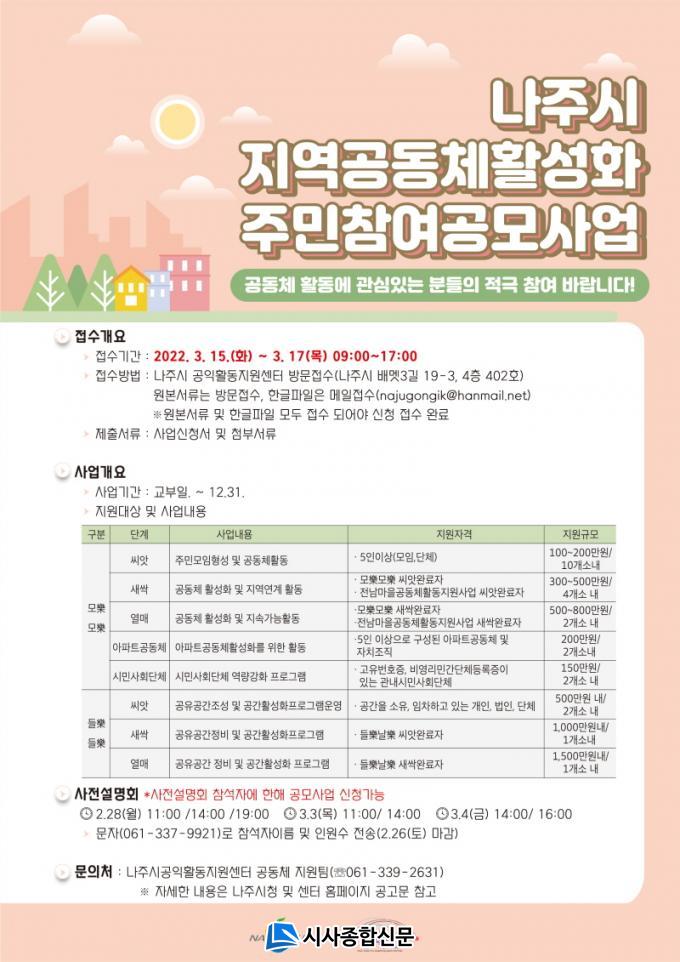 ÀÌ »ç¾÷Àº Áö¼Ó°¡´ÉÇÑ °øµ¿Ã¼ »çȸ ±¸ÇöÀ» ¸ñÇ¥·Î ÁֹεéÀÇ ´Ù¾çÇÑ È°µ¿ ¹× Ä¿¹Â´ÏƼ °ø°£À» Áö¿øÇÑ´Ù. °ø¸ð ºÐ¾ß´Â ¡®¸ðäŸðäÅ¡¯(ÁֹΠ5ÀÎ ÀÌ»óÀÇ °øµ¿Ã¼) ¡®µéäų¯äÅ¡¯(Áö¿ª¹ÎµéÀÌ È°¿ë °¡´ÉÇÑ °ø°£À» ¼ÒÀ¯¡¤ÀÓÂ÷Çϰí ÀÖ´Â °³ÀÎ ¹× ´Üü¡¤¹ýÀÎ) µî 2°³ ºÐ¾ß·Î ¿ÃÇØ 24°³¼Ò¿¡ ¿¹»ê 9800¸¸¿øÀ» Áö¿øÇÒ °èȹÀÌ´Ù.