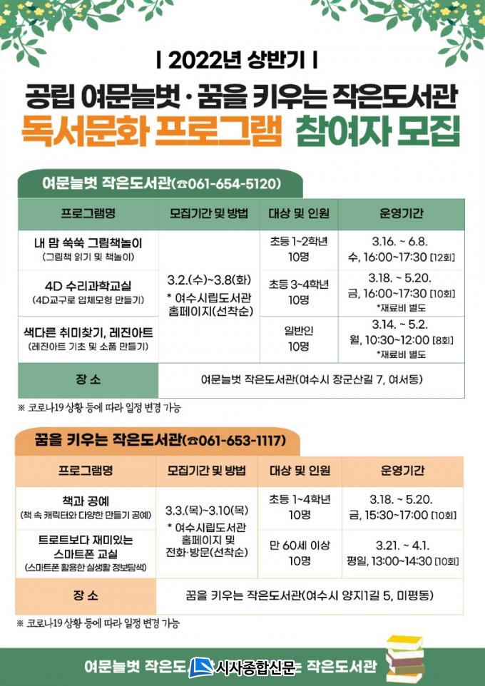 ¿©¹®´Ã¹þ ÀÛÀºµµ¼°ü ÇÁ·Î±×·¥Àº ¡ã³» ¸¾ ¾¦¾¦ ±×¸²Ã¥³îÀÌ(Ãʵî 1~2Çгâ, 10¸í) ¡ã4D ¼ö¸®°úÇб³½Ç(Ãʵî 3~4Çгâ, 10¸í) ¡ã»ö´Ù¸¥ Ãë¹Ìã±â ·¹Áø¾ÆÆ®(ÀϹÝÀÎ, 10¸í) 3°³ °úÁ¤À¸·Î ¿À´Â 3¿ù 14ÀϺÎÅÍ ÁøÇàµÈ´Ù.