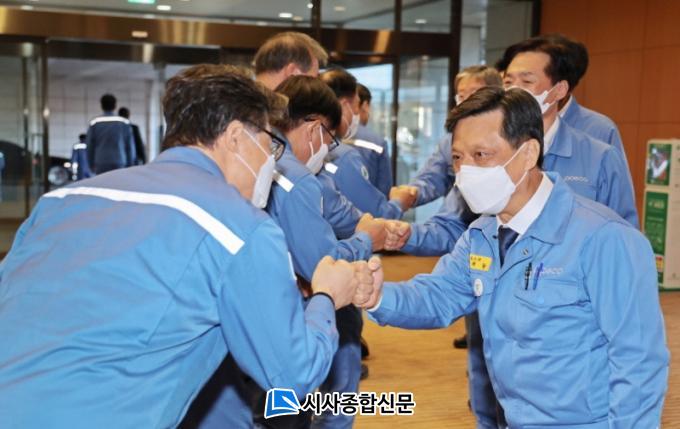 ±è ºÎȸÀåÀº ÃëÀÓ½Ä Çà»çÀÇ Çϳª·Î Á÷¿øµéÀÌ Æ÷½ºÄÚÀÇ ¹Ì·¡ ºñÀü°ú ¿ªÇÒ¿¡ ´ëÇØ ±Ã±ÝÇØ ÇÏ´Â Á¡À» ÀÚ¿¬½º·´°Ô ¹¯°í ´äÇÏ´Â ¡®¿¸°´ëÈ¡¯½Ã°£À» °¡Á³´Ù. ÀÌ ÀÚ¸®¿¡¼ ±è ºÎȸÀåÀº ¡°¿ì¸®°¡ È기 ¶¡°ú ³ë·ÂÀÇ °áÁ¤Ã¼°¡ ¼¼°è ö°»ê¾÷À» À̲ø¾î°¡´Â ¿À´ÃÀÇ Æ÷½ºÄÚÀ̸ç, Æ÷½ºÄÚÀÇ ¹Ì·¡ °æÀï·Âµµ ¹Ù·Î ¿©·¯ºÐ¡±À̶ó¸ç Á÷¿øµéÀ» °Ý·ÁÇß´Ù.