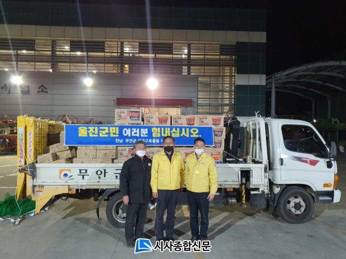 ¹«¾È±º¿¡ µû¸£¸é 7ÀÏ ¿ÀÈÄ ¹«¾È±ºÃ»¿¡¼ ÄŶó¸é°ú »ý¼ö, ¼ö°Ç, ¾çÆÄÀ½·á µîÀ» ½ÇÀº Â÷·®ÀÌ 7½Ã°£À» ´Þ·Á ¿ïÁø±º ÀÌÀç¹Î ´ëÇǼҿ¡ µµÂøÇØ ½ÇÀÇ¿¡ ºüÁø Áֹε鿡°Ô À§·Î¿Í Èñ¸ÁÀ» Áá´Ù.