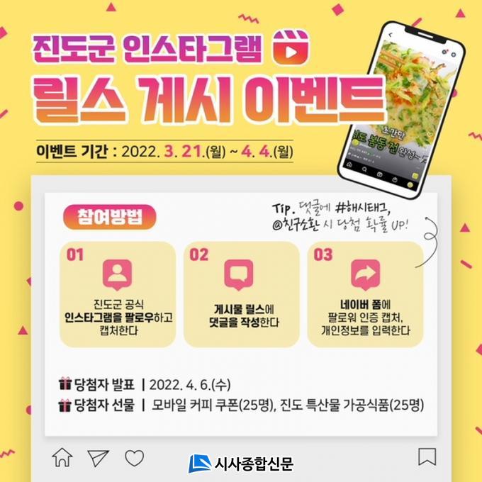 ¶Ç ¼ö·ÁÇÑ ÀÚ¿¬ °æ°ü°ú ¸Ô°Å¸®¡¤Áñ±æ°Å¸®¡¤º¼°Å¸®¡¤Ã¼Çè°Å¸®°¡ ¸ÅÀÏ ¾÷·Îµå µÇ´Â Áøµµ±º ÀνºÅ¸±×·¥ È«º¸¸¦ À§ÇØ ¡®Áøµµ±º ÀνºÅ¸±×·¥ ¸±½º °Ô½Ã À̺¥Æ®¡¯µµ ÇÔ²² ÁøÇàÇϰí ÀÖ´Ù.