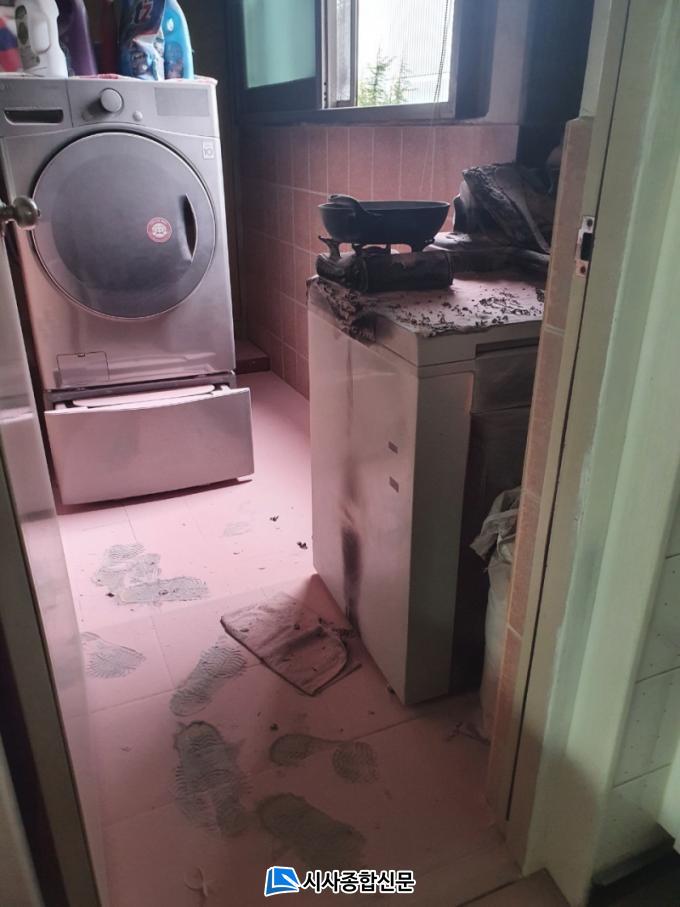 ÈÀç ¿øÀÎÀº °ü°èÀÎÀÌ ÁÖ¹æ ¹ßÄÚ´Ï¿¡ À§Ä¡ÇÑ ±èÄ¡³ÃÀå°í À§¿¡ ÈÞ´ë¿ë ¹ö³Ê »ç¿ë Áß ÇÁ¶óÀÌÆÒ º¹»ç¿¿¡ ÀÇÇØ ÈÞ´ë¿ë ¹ö³Ê ¹Ø¿¡ ±ò¸° ½ÄŹº¸¿¡ ÂøÈÇÏ¿© ¹ß»ýÇÑ ÈÀç·Î ÃßÁ¤µÇ°í ÀÖ´Ù.