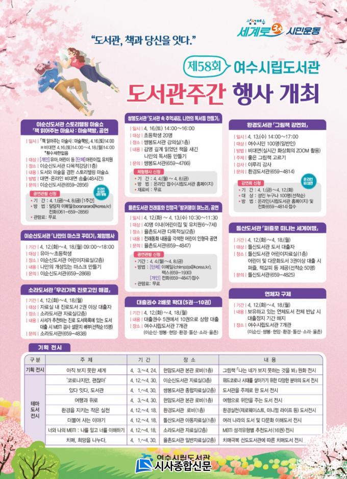 ÀÌ ¹Û¿¡µµ Àüü µµ¼°ü¿¡¼ ±âȹÀü½Ã¿Í ¿¬Ã¼ÀÚ ±¸Á¦Çà»ç¸¦ ÁøÇàÇϰí, µµ¼°üÁÖ°£¿¡´Â ´ëÃ⠱Ǽö¸¦ ±âÁ¸ 5±Ç¿¡¼ 10±ÇÀ¸·Î È®´ëÇØ Ã¥ Àд ¹®È¸¦ Á¶¼ºÇذ¥ °èȹÀÌ´Ù. Çà»ç ¼¼ºÎ³»¿ë°ú Âü¿©¹æ¹ý, ½Åû±â°£ µîÀº ¿©¼ö½Ã¸³µµ¼°ü ȨÆäÀÌÁö °øÁö»çÇ×À» ÅëÇØ È®ÀÎÇÒ ¼ö ÀÖ´Ù.