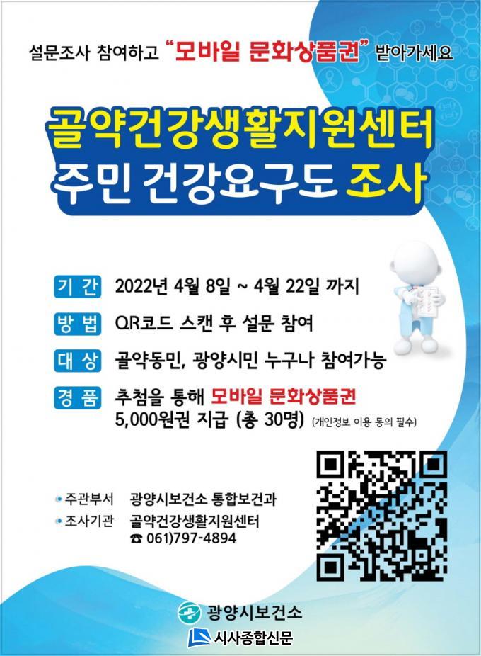 Á¶»ç°¡ ¿Ï·áµÇ¸é ¼³¹®¿¡ Âü¿©ÇÑ 30¸í¿¡°Ô Ãß÷À» ÅëÇØ ¸ð¹ÙÀÏ ¹®È»óǰ±ÇÀ» Áö±ÞÇÑ´Ù. ¼³¹®Á¶»ç´Â ¸µÅ© ÁÖ¼Ò(https://moaform.com/q/pe2OMi), QRÄÚµå ½ºÄµ, ±¤¾ç½Ã ȨÆäÀÌÁö °øÁö»çÇ×À» ÅëÇØ Âü¿©ÇÒ ¼ö ÀÖÀ¸¸ç, ±âŸ »çÇ×Àº ÅëÇÕº¸°Ç°ú °ñ¾à°Ç°ÆÀ(¢Ï061-797-4894)À¸·Î ¹®ÀÇÇÏ¸é µÈ´Ù.