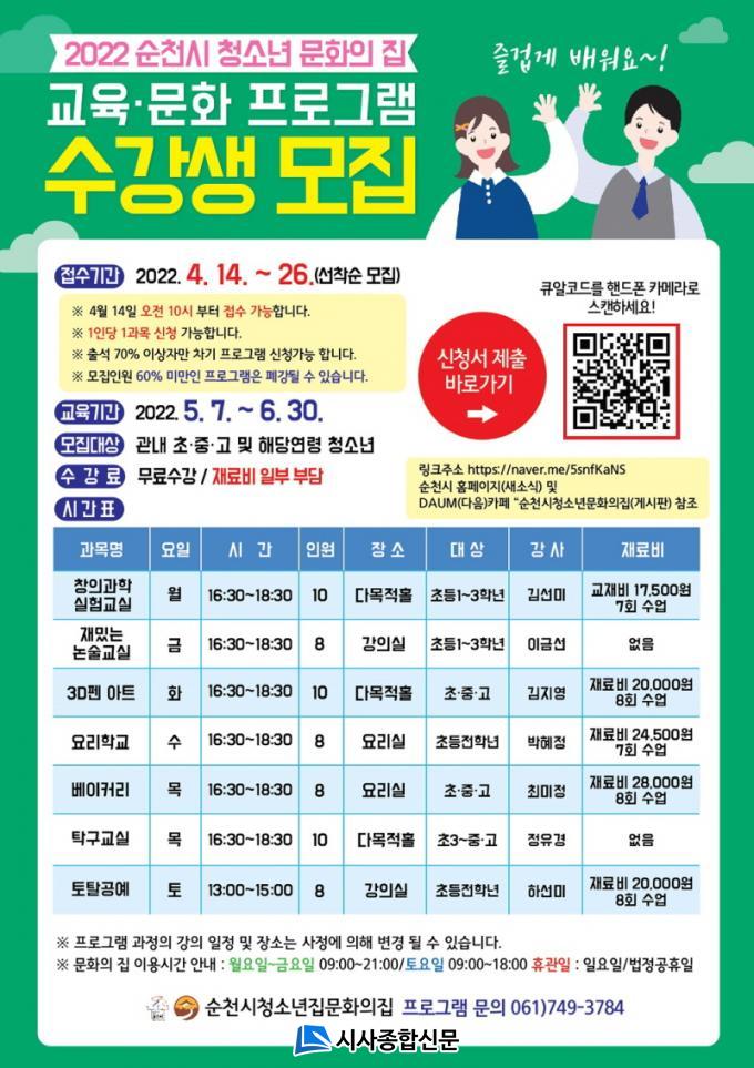 û¼Ò³â ±³À°¡¤¹®È ÇÁ·Î±×·¥¿¡ °üÇÑ ±âŸ ÀÚ¼¼ÇÑ »çÇ×Àº ¼øÃµ½Ã û¼Ò³â ¹®ÈÀÇ Áý(061-749-3782~4)À¸·Î ¹®ÀÇÇÏ¸é ¾È³»¹ÞÀ» ¼ö ÀÖ´Ù.