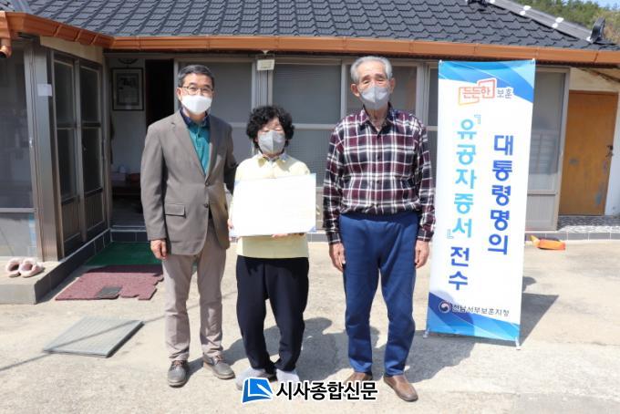 [½Ã»çÁ¾ÇսŹ® = ¿À½ÂÅà ±âÀÚ] Àü³²¼ºÎº¸ÈÆÁöû(ÁöûÀå À¯Çü¼±)Àº ´ëÇѹα¹ ÀÓ½ÃÁ¤ºÎ ¼ö¸³ ±â³äÀÏÀ» ¸Â¾Æ 12ÀÏ ½Å¾È±º ÀÚÀº¸é¿¡ °ÅÁÖÇÏ´Â ½Å±Ô µ¶¸³À¯°øÀÚ ÈļÕÀÇ ÀÚÅÃÀ» ¹æ¹®ÇÏ¿© ´ëÅë·É¸íÀÇ À¯°øÀÚ Áõ¼ Àü¼ö¿Í ÇÔ²² µ¶¸³À¯°øÀÚ ¸íÆÐ´Þ±â Çà»ç¸¦ ½Ç½ÃÇÏ¿´´Ù.