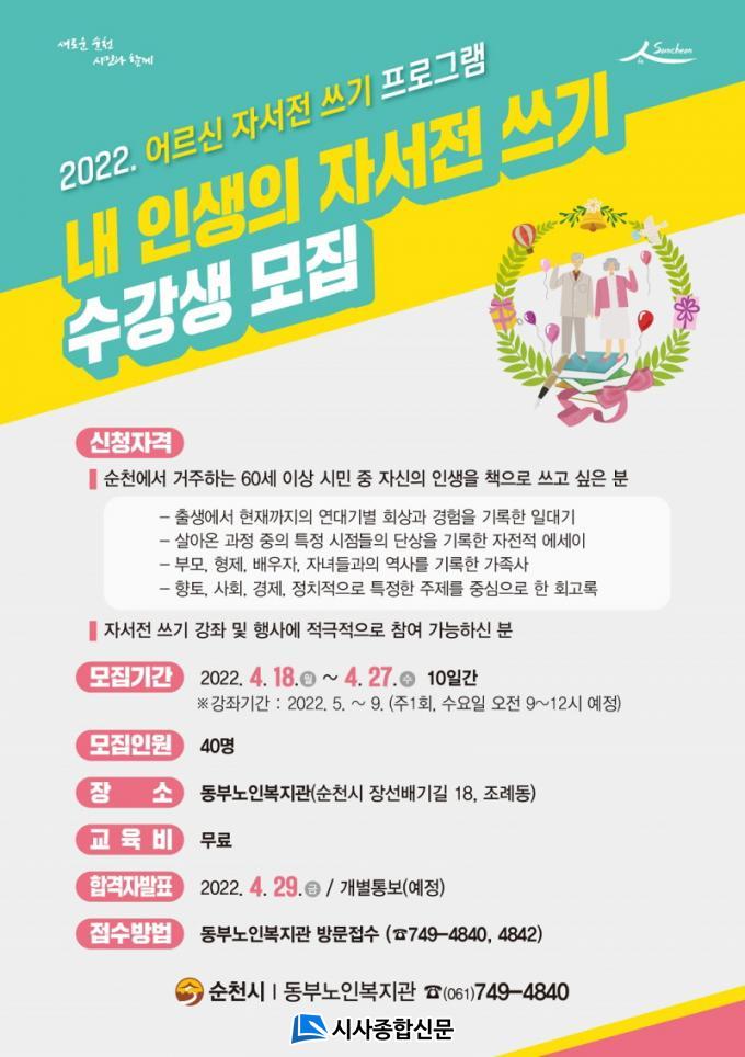 À̹ø °Á´ µ¿ºÎ³ëÀκ¹Áö°ü¿¡¼ 5¿ùºÎÅÍ 9¿ù±îÁö ¸ÅÁÖ ¼ö¿äÀÏ ¿ÀÀü¿¡ ¿î¿µÇÒ ¿¹Á¤ÀÌ´Ù. ÀÚ¼Àü ¾²±â °Á¿¡ Âü¿©¸¦ ¿øÇÏ´Â 60¼¼ ÀÌ»ó ¼øÃµ½Ã¹ÎÀº ¿À´Â 18ÀϺÎÅÍ 27ÀϱîÁö ½ÅºÐÁõÀ» ÁöÂüÇÏ¿© µ¿ºÎ³ëÀκ¹Áö°ü(¼øÃµ½Ã Àå¼±¹è±â±æ 18, 061-749-4840)¿¡ ¹æ¹®ÇÏ¿© ½ÅûÇÏ¸é µÈ´Ù.