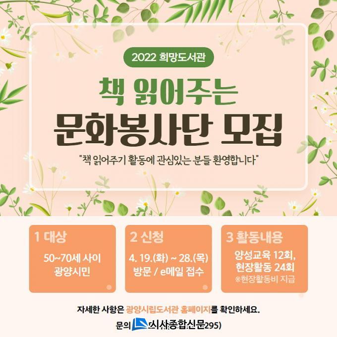 ÇÑÆí, ¹®ÈºÀ»ç´Ü ¹æ¹®±â°üÀº ±¤¾çÁö¿ª 20°³¼Ò(Áö¿ª¾Æµ¿¼¾ÅÍ 10°³, ³ëÀαâ°ü 8°³, Àå¾ÖÀαâ°ü 2°³)·Î 4¿ù 28ÀϺÎÅÍ ¸ðÁýÇÒ °èȹÀ̸ç, Âü¿©¸¦ ¿øÇÏ´Â ±â°üÀº ±¤¾çÈñ¸Áµµ¼°ü(¢Ï061-797-4295)¿¡ ¹®ÀÇÇÏ¸é ¾È³»¹ÞÀ» ¼ö ÀÖ´Ù.