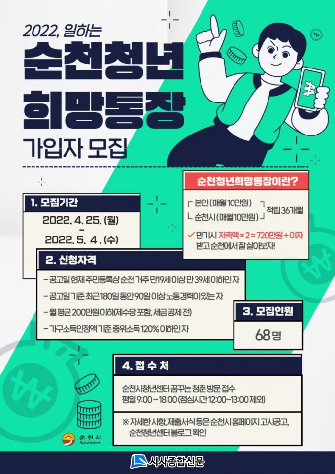 ¼øÃµ½Ã¿Í û³âµéÀÌ ÅëÀåÀ» °³¼³ÇØ 1:1¸ÅĪ »ç¾÷À¸·Î ¸Å¿ù 10¸¸¿ø¾¿ 36°³¿ù°£ °øµ¿ Àû¸³ÇØ ¸¸±â ½Ã û³âÀÌ Àû¸³ÇÑ ±Ý¾×ÀÇ µÎ ¹èÀÎ 720¸¸¿ø°ú ÀÌ¿¡ µû¸¥ ÀÌÀÚ¸¦ Áö¿ø¹ÞÀ» ¼ö ÀÖ´Â »ç¾÷À¸·Î, 2018³âºÎÅÍ ÇöÀç±îÁö ÃÑ 425¸íÀÇ Ã»³âµéÀÌ ¸ñµ·¸¶·Ã Áö¿øÀ» ¹Þ°í ÀÖ´Ù.
