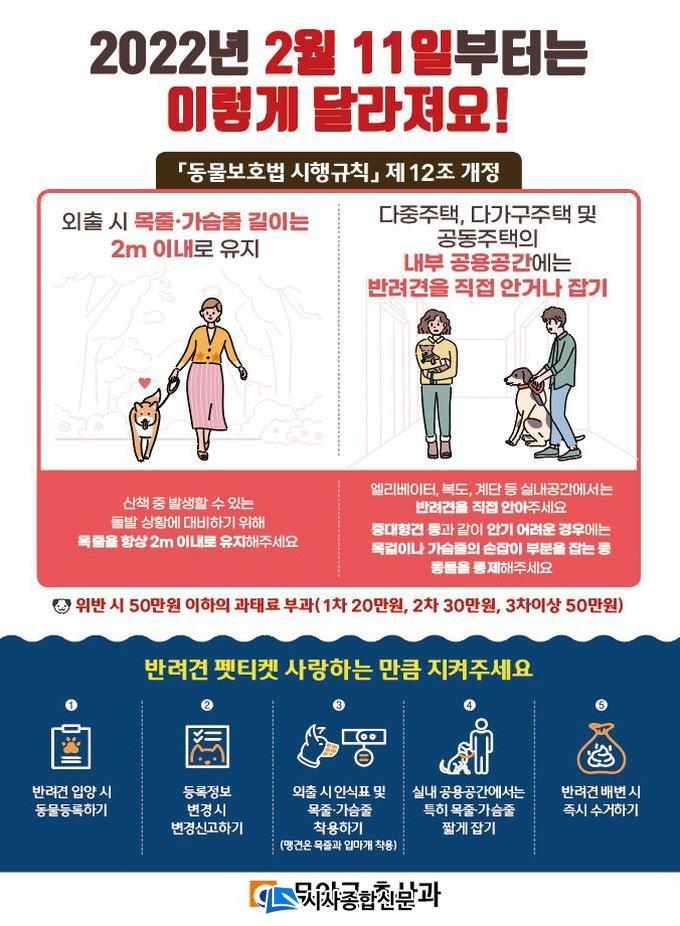 ÁÖ¿ä È«º¸³»¿ëÀº °³Á¤µÈ µ¿¹°º¸È£¹ý ½ÃÇà±ÔÄ¢¿¡ µû¶ó ¹Ý·Á°ß°ú ¿ÜÃ⠽à ¸ñÁÙ¡¤°¡½¿ÁÙ ±æÀ̸¦ 2m À̳»·Î À¯ÁöÇϱâ, °øµ¿ÁÖÅᤴٰ¡±¸ÁÖÅà ³»ºÎ °ø¿ë°ø°£¿¡¼´Â ¹Ý·Á°ßÀ» Á÷Á¢ ¾È°Å³ª Àâ±â µîÀÌ´Ù.
