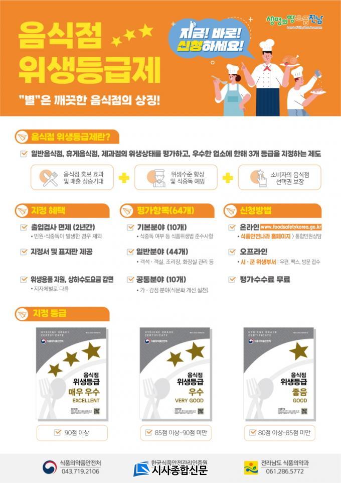 ÇöÀç Àü³²ÀÇ À§»ýµî±ÞÁ¦ ´ë»ó¾÷¼Ò´Â 3¸¸ 6õ249°³¼Ò´Ù. ÀÌ Áß 919°³¼Ò°¡ À§»ýµî±ÞÀ» ÁöÁ¤¹Þ¾Æ ¿î¿µ ÁßÀÌ´Ù. ÀÌµé ¾÷¼Ò¿¡´Â ÁöÁ¤¼¿Í Ç¥ÁöÆÇ Á¦°ø, 2³â°£ À§»ý°Ë»ç ¸éÁ¦, 18¸¸ ¿ø »ó´ç À§»ý¿ëǰ Áö¿ø µî ´Ù¾çÇÑ ÇýÅÃÀÌ ÁÖ¾îÁø´Ù.