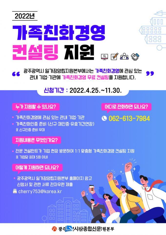 ±¤Áֽÿ¡¼´Â Áö³ÇØ 19°³ ±â¾÷¡¤±â°üÀÌ °¡Á·Ä£ÈÀÎÁõÀ» ½Å±Ô·Î ȹµæÇßÀ¸¸ç, ÃÑ 112°³ÀÇ °¡Á·Ä£ÈÀÎÁõ±â¾÷¡¤±â°üÀÌ ÀÖ´Ù. ÄÁ¼³ÆÃÀ» Èñ¸ÁÇÏ´Â ±â¾÷¡¤±â°üÀº ±¤Áֽà ȨÆäÀÌÁö °øÁö»çÇ× ¶Ç´Â ±¤ÁÖÀϰ¡Á¤¾ç¸³Áö¿øº»ºÎ ȨÆäÀÌÁö ¾Ë¸®´Â ±Û¿¡¼ ½Åû¼¸¦ ³»·Á¹Þ¾Æ ÀÛ¼ºÇÑ ÈÄ À̸ÞÀÏ(cherry753@korea.kr)·Î ½ÅûÇÏ¸é µÈ´Ù. ÀÚ¼¼ÇÑ ³»¿ëÀº Àϰ¡Á¤¾ç¸³Áö¿øº»ºÎ(062-613-7984)¿¡¼ È®ÀÎÇÒ ¼ö ÀÖ´Ù.
