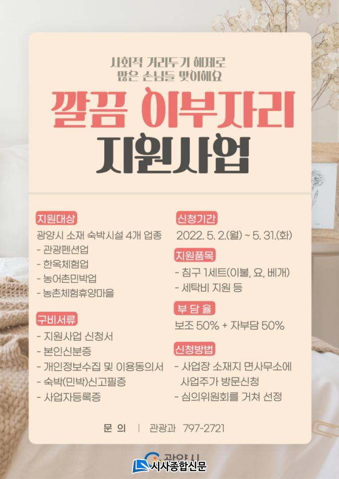 Àü¶ó³²µµ-±¤¾ç½Ã º¸Á¶»ç¾÷À¸·Î ÃßÁøÇÏ´Â ±ò²û À̺ÎÀÚ¸® Áö¿øÀº Áö¿ª ³» ¼÷¹Ú¾÷ü¿¡ ħ±¸·ù¸¦ º¸±ÞÇϰí, Çѹø »ç¿ëÇÑ Ä§±¸·ù´Â À§»ý ¾ÈÀüÀ» À§ÇØ ¼¼Å¹ÇØ »ç¿ëÇϵµ·Ï ¼¼Å¹ºñ¸¦ Áö¿øÇÏ´Â »ç¾÷ÀÌ´Ù.