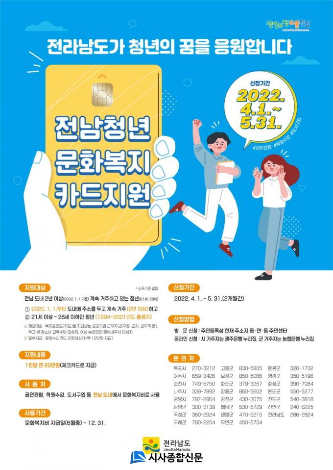 ¿ÃÇØ óÀ½À¸·Î ½ÃÇàµÇ´Â ¡®Àü³²Ã»³â ¹®Èº¹ÁöÄ«µå Áö¿ø»ç¾÷¡¯Àº 2020³â 1¿ù 1ÀÏ ÀüºÎÅÍ Àü¶ó³²µµ¿¡ ÁÖ¼Ò¸¦ µÎ°í 2³â ÀÌ»ó °è¼Ó °ÅÁÖÇϰí ÀÖ´Â 21¼¼~28¼¼(1994~2001³â»ý) û³â¿¡°Ô 1ÀÎ´ç ¿¬ 20¸¸ ¿øÀÇ ¹®Èº¹Áöºñ¸¦ Áö±ÞÇÏ´Â »ç¾÷ÀÌ´Ù.