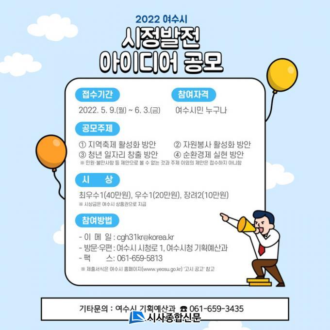 cgh31kr@korea.kr), ¿ìÆí(¿©¼ö½Ã ½Ãû·Î1, ¿©¼ö½Ã ±âȹ¿¹»ê°ú) ¶Ç´Â ÆÑ½º(¢Ï061-659-5813)·Î ½Åû °¡´ÉÇÏ´Ù. Á¢¼öµÈ ¾ÆÀ̵ð¾î´Â ½Ç½Ã°¡´É¼º, âÀǼº, È¿°ú¼º µî 7°³ ½É»çÇ׸ñÀ» ±âÁØÀ¸·Î ¼±Á¤µÇ¸ç, ¿©¼ö½Ã Á¦¾È½É»ç½Ç¹«À§¿øÈ¸ ½ÉÀǸ¦ °ÅÃÄ 6¿ù Áß ´ç¼±ÀÛÀÌ ¹ßÇ¥µÉ ¿¹Á¤ÀÌ´Ù.