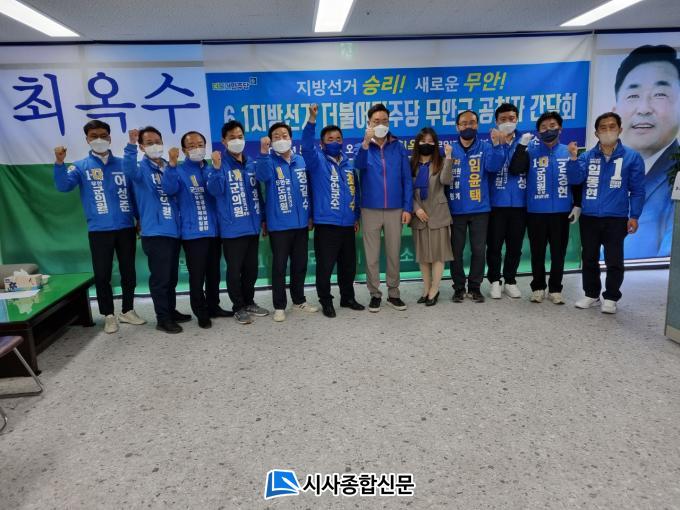 ¡®¹«¾È±º °øÃµÀÚ 12¸íÀº À̳¯ ¿ÀÀü 10½Ã ÃÖ¿Á¼ö ¹«¾È±º¼ö Èĺ¸ ¼±°Å»ç¹«¿¡¼ ¡®6¡¤1 Áö¹æ¼±°Å ´õºÒ¾î¹ÎÁÖ´ç ¹«¾È±º °øÃµÀÚ °£´ãȸ¡¯¸¦ ¿°í ¹ÎÁÖ´ç ¿øÆÀ ±¸¼º°ú Áö¹æ¼±°Å ½Â¸®¸¦ À§ÇÑ ³íÀǸ¦ ÁøÇàÇß´Ù. °øÃµÀÚµéÀº °£´ãȸ ÀÌÈÄ ÃæÈ¥Å¾À» ã¾Æ °áÀǸ¦ ´ÙÁö°í ¹ÎÁÖ´ç Èĺ¸·Î¼ »ç½Ç»ó ù °ø½Ä Çຸ¿¡ ³ª¼¹´Ù.