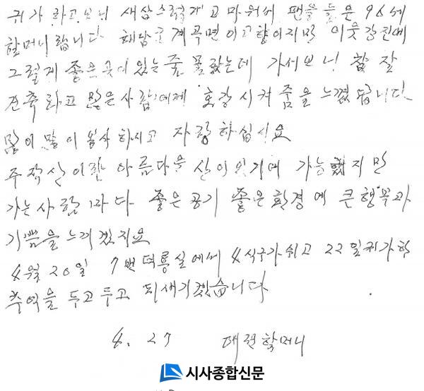 ÆíÁö ¹ß¼ÛÀÎÀº ÇØ³²±º °è°î¸éÀÌ °íÇâÀÌ°í ´ëÀü¿¡¼ °ÅÁÖÇÏ°í °è½Å 96¼¼ÀÇ ÇÒ¸Ó´Ï¿´´Ù. Áö³ 4¿ù 20ÀÏ °¡Á·µé°ú ÇÔ²² 2¹Ú 3Àϰ£ ÁÖÀÛ»ê È޾縲¿¡¼ Áö³»¸é¼ ÁÁÀº °Ç¹°, ÁÁÀº °ø±â µî Ãß¾ïÀ» ¸¹ÀÌ ¸¸µé¾î °¥ ¼ö ÀÖ¾î °í¸¿´Ù´Â ³»¿ëÀ̾ú´Ù. ÁÖÀÛ»êÀ̶õ ¾Æ¸§´Ù¿î »ê°ú ½Ã°ñ dz°æÀÌ ¾î¿ì·¯Áø È޾縲¿¡¼ÀÇ ¼÷¹ÚÀÌ Å« ÇູÀ̾ú´Ù´Â ÇÒ¸Ó´ÏÀÇ ¼Å÷ ±Û¾¾Ã¼¿¡¼ Áø½ÉÀÌ ´À²¸Áø´Ù.
