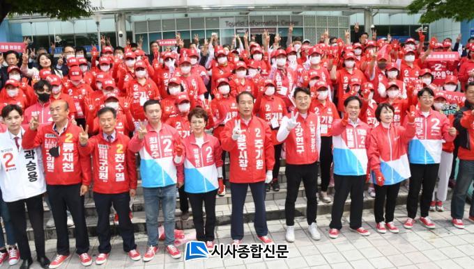 [½Ã»çÁ¾ÇսŹ® = ¿À½ÂÅà ±âÀÚ] ÁÖ±âȯ ±¹¹ÎÀÇÈû ±¤ÁÖ±¤¿ª½ÃÀå È帴 °ø½Ä ¼±°Å¿îµ¿ ù³¯ÀÎ 19ÀÏ ¿ÀÀü ±¤ÁÖ¿ª ±¤Àå¿¡¼ ±¹¹ÎÀÇÈû ¼Ò¼Ó ±¸Ã»Àå, Áö¹æÀÇ¿ø È帵é°ú ÇÔ²² ÃâÁ¤½ÄÀ» °®°í ¡°Áß¾Ó Á¤ºÎ°¡ ¹Ù²î¾ú´Âµ¥µµ ±¤ÁÖ¿¡¼´Â ±¹¹ÎÀÇÈûÀÌ ¾ÆÁ÷ ¾ß´çÀÎ °Í °°´Ù¡±¸ç ¡°ÁøÁ¤ÇÑ ¿©´ç Èĺ¸·Î¼ Á¤Ä¡ÀÇ Á߽ɿ¡ ¼³ °ÍÀÓÀ» ¼±¾ðÇÑ´Ù¡±°í Çʽ¿¡ ´ëÇÑ °¢¿À¸¦ ´ÙÁ³´Ù.