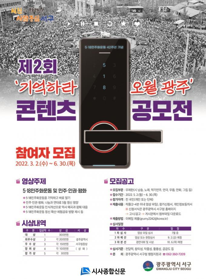 À̹ø °ø¸ðÀüÀº 5¡¤18¹ÎÁÖȿ¿¡ ´ëÇÑ Àü ±¹¹ÎÀÇ ±â¾ï°ú °ü½Éµµ¸¦ ³ôÀ̱â À§ÇØ ¸¶·ÃµÇ¾úÀ¸¸ç °ø¸ð ³»¿ëÀº 5¡¤18À» ºñ·ÔÇÑ ¹ÎÁÖ¡¤Àαǡ¤Æòȸ¦ ÁÖÁ¦·Î ½Ã ³¶¼Û, ³ë·¡, ¾Ç±â¿¬ÁÖ, ¿¬±Ø, ¹«¿ë, ¸¸È, ±×¸² µî °³ÀÎ ¶Ç´Â ´Üü(10ÀÎÀ̳»)·Î Âü¿©°¡ °¡´É ÇÏÁö¸¸ Áߺ¹ Á¢¼ö´Â ÇÒ ¼ö ¾ø´Ù.