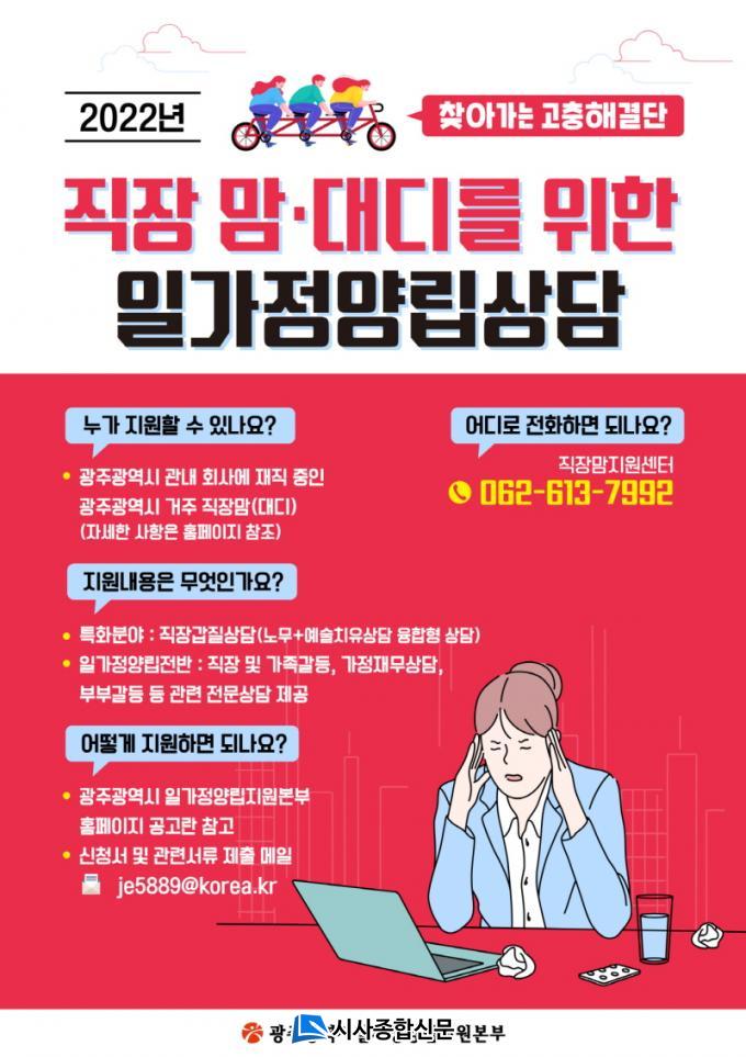 Àϰ¡Á¤¾ç¸³Àü¹Ý »ó´ãÀº Á÷Àå°ú °¡Á·°¥µî µî ´Ù¾çÇÑ ºÐ¾ß¿¡ ´ëÇØ Àü¹®°¡µéÀÌ »ó´ãÀ» Áö¿øÇÑ´Ù. ½ÅûÀÚ°ÝÀº ±¤Áֽà °ÅÁÖ ÀÏÇÏ´Â Á÷À帾¡¤´ëµð·Î 30ÀϺÎÅÍ ¿¹»ê ¼ÒÁø ½Ã±îÁö Á¢¼öÇϸç Àü¾× ¹«·á´Ù. ½ÅûÀÚ°¡ ¿øÇÏ´Â Àå¼Ò¿Í ½Ã°£À» ¼±ÅÃÇÒ ¼ö ÀÖÀ¸¸ç ºñ´ë¸éÀ¸·Îµµ °¡´ÉÇÏ´Ù.