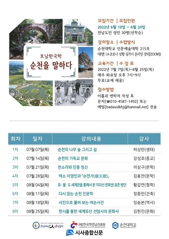¼øÃµ´ë Àι®Çмú¿øÀº (Àç)Çѱ¹ÇÐÈ£³²ÁøÈï¿øÀÇ È£³²Çѱ¹ÇРȰ¼ºÈ ¹× À§»ó Á¦°í¸¦ À§ÇÑ ¡®È£³²Çѱ¹ÇÐ °Á ¹× Çмú´ëȸ Áö¿ø °ø¸ð »ç¾÷¡¯¿¡ ¼±Á¤µÇ¾î, Àü³²µµ¹Î 30¸íÀ» ´ë»óÀ¸·Î ¡®È£³²Çѱ¹ÇÐ ¼øÃµÀ» ¸»ÇÏ´Ù¡¯ °ÀǸ¦ ¹«·á·Î Á¦°øÇÑ´Ù.