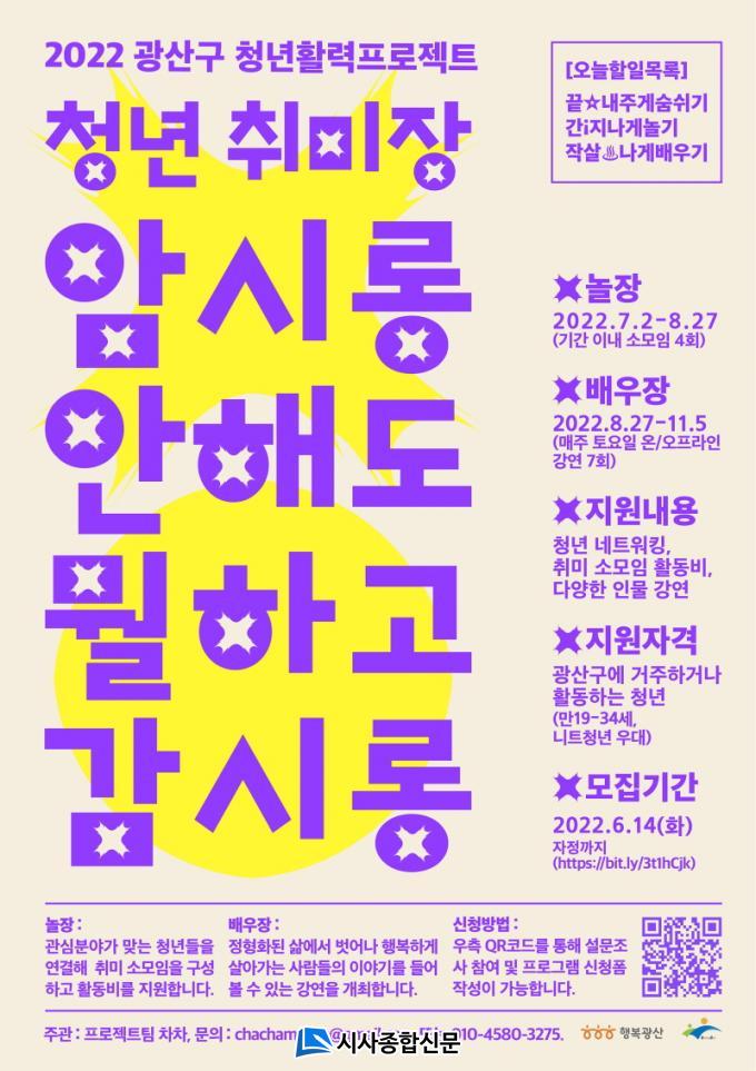 ¸ðÁý ´ë»óÀº ±¤»ê±¸¿¡ °ÅÁÖÇϰųª Ȱµ¿Çϴ û³â(¸¸19~34¼¼)À¸·Î, 14ÀϱîÁö ¿Â¶óÀÎ Æû(https://bit.ly/3t1hCjk)¿¡ Á¢¼ÓÇØ ½Åû¼¸¦ ÀÛ¼º, Á¦ÃâÇÏ¸é µÈ´Ù.(À¥Æ÷½ºÅÍ QRÄÚµå ÀÌ¿ë °¡´É)