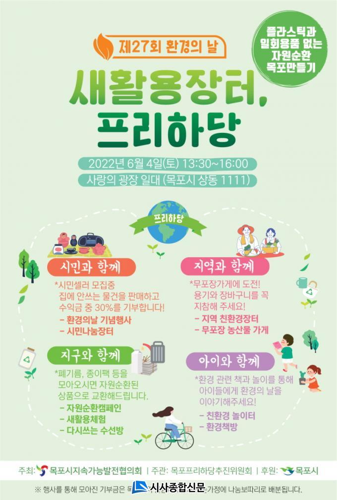 ¸ñÆ÷½Ã ÈÄ¿ø, ¸ñÆ÷½ÃÁö¼Ó°¡´É¹ßÀüÇùÀÇȸ ÁÖÃÖ, ¸ñÆ÷ÇÁ¸®ÇÏ´çÃßÁøÀ§¿øÈ¸ ÁÖ°üÀÇ À̹ø Çà»ç´Â 20°³ ȯ°æ․»çȸ´Üü ȸ¿øµé°ú ½Ã¹Î, û¼Ò³â µî 500¿©¸íÀÌ Âü¼®ÇÒ ¿¹Á¤ÀÎ °¡¿îµ¥ ¿ÀÈÄ 1½Ã30ºÐºÎÅÍ ¼ÒÇÁ¶ó³ë ¹®¾È³ª °ø¿¬À» ½ÃÀÛÀ¸·Î ¿ÀÈÄ 4½Ã±îÁö ³ª´®ÀåÅÍ, ´Ù½Ã¾²°í °íÃľ²±â Ä·ÆäÀÎ, ģȯ°æ ¾÷»çÀÌŬ üÇèȰµ¿, ģȯ°æ ³îÀÌÅÍ µîÀ» ¿î¿µÇÑ´Ù.
