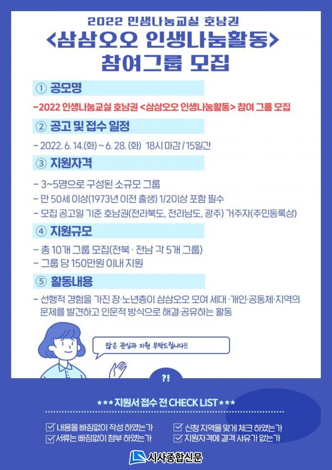2022 Àλý³ª´®±³½Ç È£³²±Ç ¡®»ï»ï¿À¿À Àλý³ª´®È°µ¿¡¯Àº °³Àμ¼´ë‧°øµ¿Ã¼‧Áö¿ªÀÇ ¹®Á¦¿Í °í¹ÎµéÀ» Àå‧³ë³â¼¼´ëÀÇ ½Ã°¢À¸·Î ¹ß°ßÇÏ°í °æÇè°ú ½ÇõÀ¸·Î ÁöÇý·Î¿î ÇØ¹ýÀ» ã¾Æº¸´Â Ȱµ¿ÀÌ´Ù. 50¼¼ ÀÌ»ó Àå‧³ë³â¼¼´ëÀÇ ¼Ò±Ô¸ð Àι® Ȱµ¿À» Áö¿øÇÏ´Â »ç¾÷À¸·Î ±×·ì ´ç ÃÖ´ë 150¸¸ ¿øÀ» Áö¿øÇÑ´Ù.