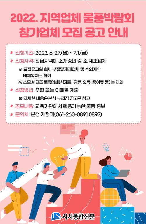 Àü³²µµ±³À°Ã»Àº Àü¶ó³²µµ¿¡ ÁÖ¼Ò¸¦ µÎ°í ½ÇÁúÀûÀÎ ¿µ¾÷ÇàÀ§¸¦ Çϰí ÀÖ´Â Áß¡¤¼Ò Á¦Á¶¾÷ü¸¦ ´ë»óÀ¸·Î ¿À´Â 10¿ù 20ÀÏ(¸ñ) ~ 21ÀÏ(±Ý) ¼øÃµ¸¸»ýŹ®È±³À°¿ø 1Ãþ ´Ù¸ñÀûȦ¿¡¼ ¡®2022. Áö¿ª¾÷ü ¹°Ç°¹Ú¶÷ȸ¡¯¸¦ °³ÃÖÇÒ ¿¹Á¤ÀÌ´Ù.