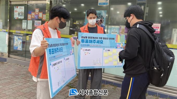 ¿î³²µ¿Àº Áö³ 20ÀϺÎÅÍ 22ÀϱîÁö dz¿µÁ¤Ãµ »êÃ¥·Î, ¾ÆÆÄÆ® »ó°¡ ÀÏ´ë¿¡¼ Áö¿ª ȯ°æ°³¼± ºÐ¾ß ¿ì¼±¼øÀ§ ¼±Á¤À» À§ÇØ ÁÖ¹ÎÀ» ´ë»óÀ¸·Î ÇöÀåÅõÇ¥¸¦ ½Ç½ÃÇß´Ù. ¾Õ¼ ¿î³²µ¿Àº ÁÖ¹ÎÀÌ Ã¼°¨Çϴ ȯ°æ °³¼±À» À§ÇØ ¡®ÇÔ²²ÇØ¿ä, ¿î³² ȯ°æ care(Äɾî)¡¯¸¦ ¼º°ú°ü¸® ÁöÇ¥·Î »ï°í, ¾²·¹±â ¹®Á¦, ¹æ¿ª, ²É ½ÄÀç µî ÁÖ¿ä °úÁ¦¸¦ ¸¶·ÃÇß´Ù.