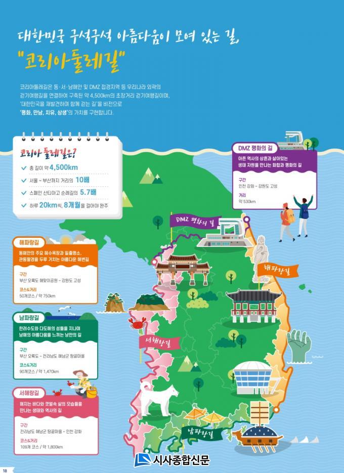 Áö³ 22ÀÏ¿¡´Â ÄÚ¸®¾ÆµÑ·¹±æÀÇ ¸¶Áö¸· ±¸°£ÀΡ®¼Çضû±æ¡¯ÀÌ °³ÅëÇß´Ù. ¼Çضû±æÀº ¿ì¸®³ª¶ó ¼ÇؾÈÀ» ¿¬°áÇØ ÇØ³² ¶¥³¡¿¡¼ ÀÎõ °È±îÁö À̾îÁö´Â ±¹³» ÃÖÀå °È±â ¿©Çà±æÀÌ´Ù. ¼ÂÊ ¹Ù´Ù¿Í ÇÔ²² °È´Â ±æ·Î, ¼ÇؾÈÀÇ °¹¹ú, ³«Á¶, ÇØ¼Ö±º¶ô µî ¾Æ¸§´Ù¿î ÀÚ¿¬°æ°ü°ú ÇÔ²² ³ó¾îÃÌÀÇ ¼Ò¹ÚÇÑ ½Ã°ñ±æ Á¤°æ µîÀ» üÇèÇÒ ¼ö ÀÖµµ·Ï 103ÄÚ½º¿Í Áö¼±6ÄÚ½º 1,800km·Î ±¸¼ºµÇ¾ú´Ù.