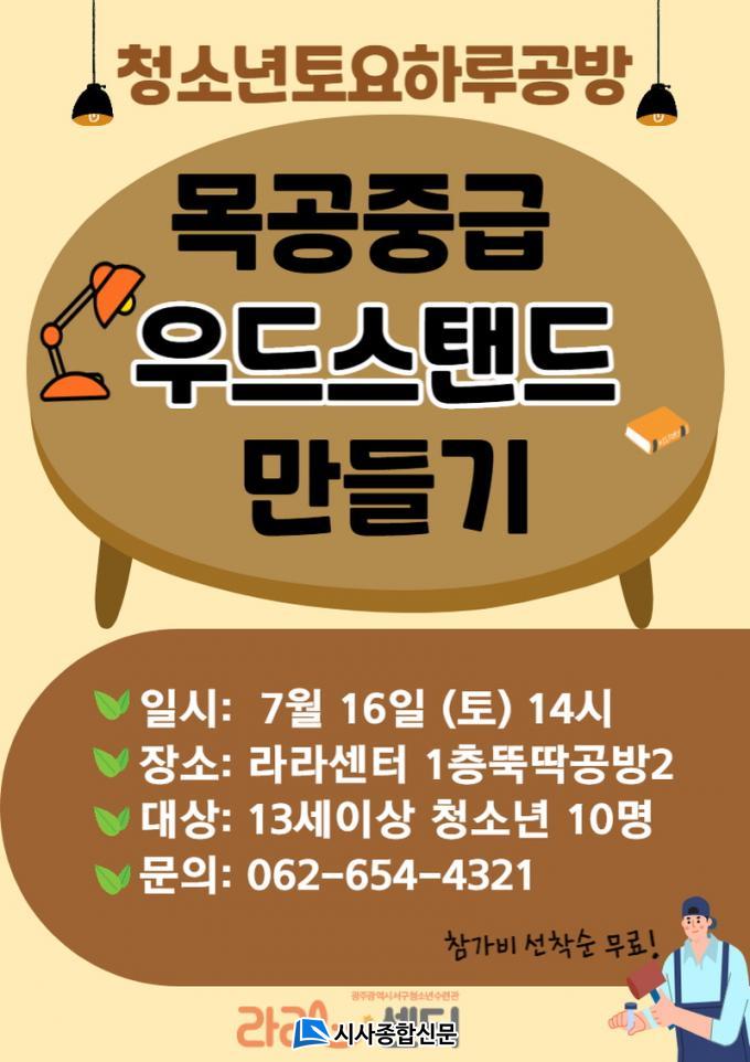 ´ÙÀ½ ½Ã°£¿¡´Â 7¿ù 16ÀÏ ¸ñ°øÁß±ÞÀ» Ȱ¿ëÇÑ ¿ìµå½ºÅÄµå ¸¸µé±â°¡ ÁøÇà µÉ ¿¹Á¤À̸ç, ¸ðÁý´ë»óÀº 13¼¼ÀÌ»ó û¼Ò³â 10¸íÀ¸·Î ¼±Âø¼ø ¹«·á·Î ÀüÈ Á¢¼öÇÒ ¼ö ÀÖ´Ù. ÀÚ¼¼ÇÑ »çÇ×Àº 062-654-4321·Î ¹®ÀÇÇÏ¸é µÈ´Ù.